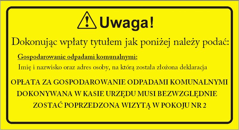 w tytule przelewu prosimy wpisaæ "Op³ata za gospodarowanie odpadami" oraz podaæ imiê i nazwisko osoby, na któr± sk³adana by³a deklaracja wraz z adresem posesji