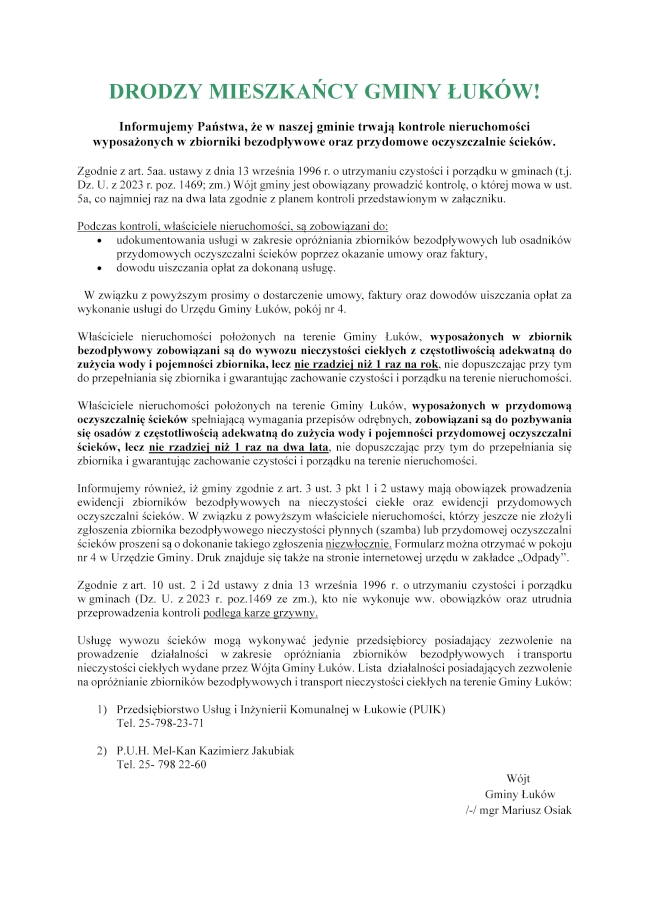 Plan kontroli zbiorników bezodp³ywowych i przydomowych oczyszczalni ¶cieków